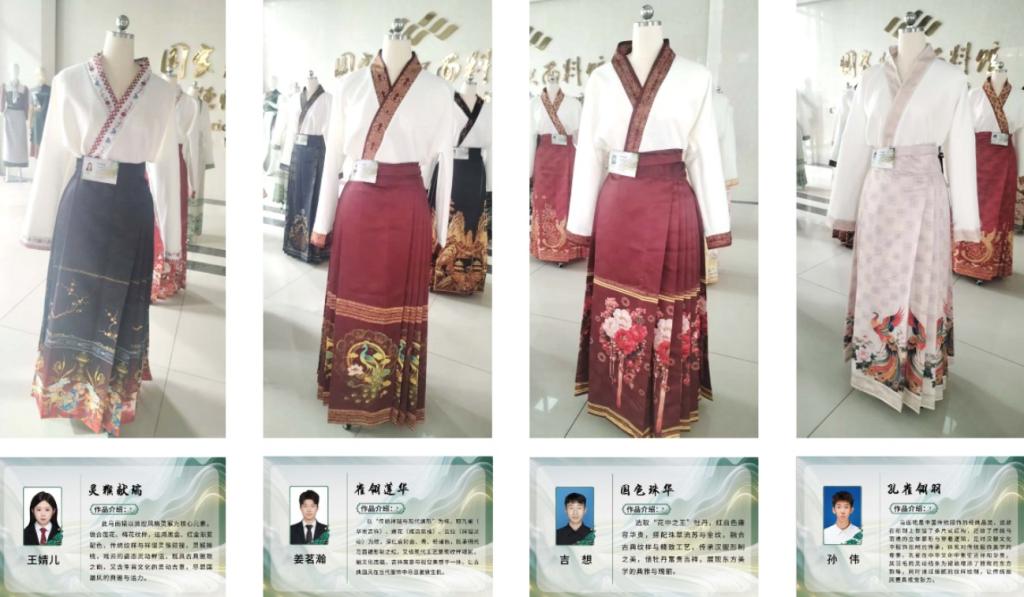 实习过程中,大家先以文化为锚——聆听汉服文化讲座、观摩汉服生产线,在理论与产业实景中摸清传统服饰的脉络;再以双手为笔,亲手完成交领右衽上衣与马面裙的整套设计,融入水墨、瑞兽、花卉与萌趣图案元素,让每件作品都成为“传统骨架+当代表情”的载体,共同构成《交领·锦色:鲁锦班汉服实践作品辑》的核心内容。